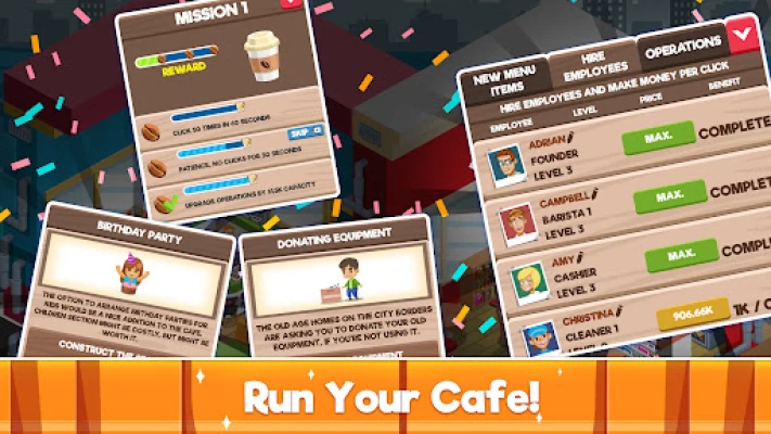 اپنا کیفے کاروبار شروع کریں اور اپنی کافی شاپ کو کامیابی کی بلندیوں پر لے جائیں۔ بس ٹیپ کرکے گاہکوں کو اپنی دکان میں مدعو کریں، اپنے کیفے کو وسعت دیں اور اگلے کیفے ٹائکون بنیں۔