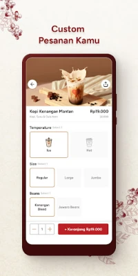 Kopi Kenangan App کے ساتھ اپنے ہر آرڈر کو اپنی مرضی کے مطابق بنائیں۔ آپ درجہ حرارت، سائز، چینی، برف، ٹاپنگز، اور دیگر اقسام کے لحاظ سے اپنے مشروبات کو ذاتی بنا سکتے ہیں۔ کافی کے علاوہ، Kopi Kenangan App آپ کو دیگر ذائقہ دار پیشکشوں تک رسائی بھی فراہم کرتا ہے۔ ہمارے مختلف برانڈز میں Cerita Roti کی سنہری اور نرم روٹی، Chigo! کی انتہائی لذیذ فرائیڈ چکن، یا Kenangan Manis کے نرم کوکیز شامل ہیں، جو آپ کے کافی کے تجربے کو مزید مکمل بناتے ہیں۔ اپنی مصروفیات کے مطابق پک اپ کا وقت مقرر کریں، اور ہماری ٹیم اس بات کو یقینی بنائے گی کہ آپ کا آرڈر آپ کی آمد سے پہلے تازہ ترین حالت میں تیار ہو۔