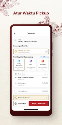 Kopi Kenangan App آپ کے آرڈر کے ہر مرحلے پر حقیقی وقت میں آپ کو باخبر رکھتا ہے۔ جب آپ کا آرڈر تیار ہو جائے گا، تو آپ براہ راست آؤٹ لیٹ پر جائیں اور مخصوص پک اپ ایریا سے بغیر کسی قطار کے اپنا سامان وصول کر لیں۔ ادائیگی کے لیے، ایپ میں ای-والٹس، ڈیبٹ کارڈز، اور کریڈٹ کارڈز سمیت متعدد آپشنز دستیاب ہیں، جو آپ کو رابطہ کم کرنے اور وقت بچانے میں مدد دیتے ہیں۔ مزید برآں، ایپ میں ہر خریداری پر "دل" پوائنٹس جمع کریں اور پانچ ممبرشپ لیولز میں ترقی حاصل کریں۔ جیسے جیسے آپ کی سطح بلند ہوتی جائے گی، خصوصی فوائد اور پیشکشوں سے لطف اٹھائیں۔ Kopi Kenangan App صرف آپ کی کافی کا تجربہ نہیں، بلکہ سہولت اور انعامات کا ایک مکمل پیکج ہے۔
